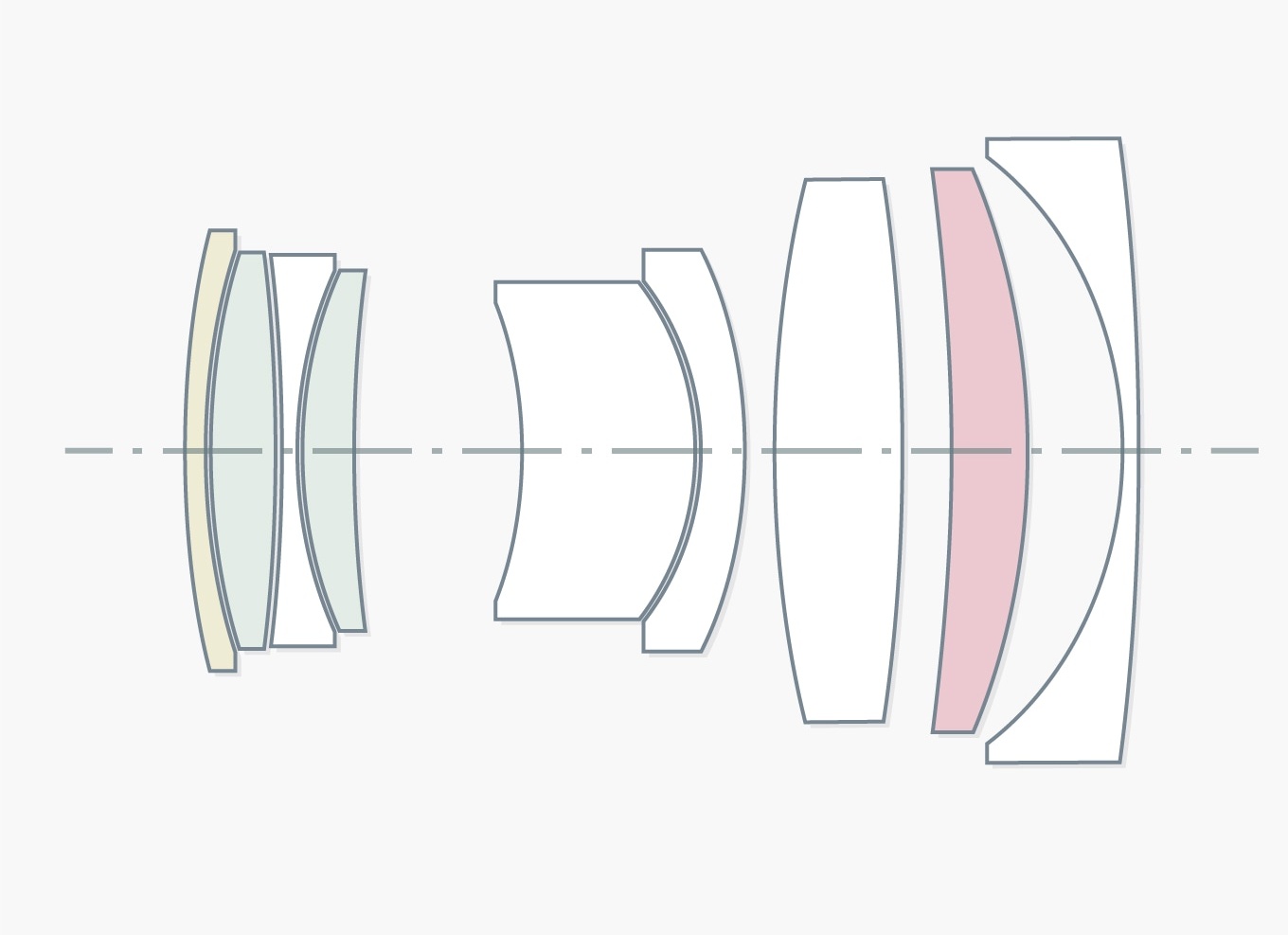 Hét lencsetagjából három nagy törésmutatójú, amely segített az alacsony tömeg elérésében, egy pedig aszférikus, amely a képsarki leképezést hivatott javítani.